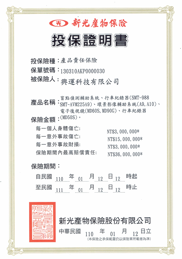 SIMTEC : 盲點偵測系統BSM/行車紀錄器SMT-988/環景影像輔助系統SMT-AVM225A9、SMT-AVM225A10/電子後視鏡MD50S、MD60S、MD90S 已續保產品責任險
